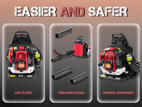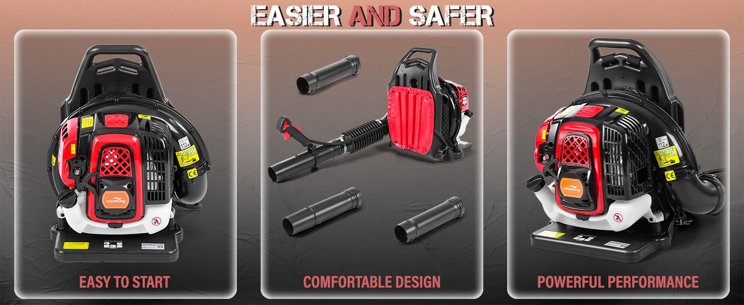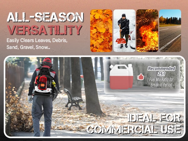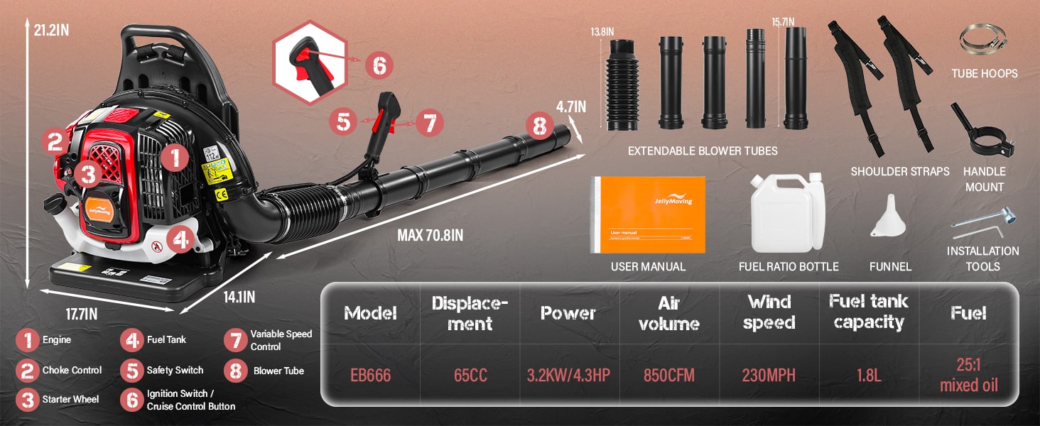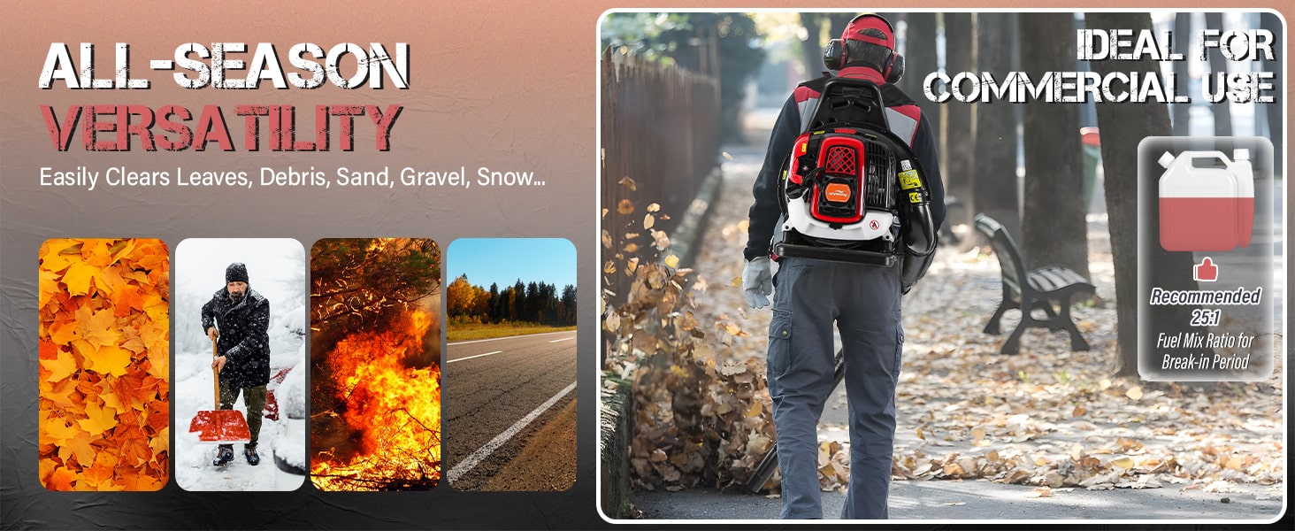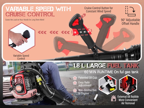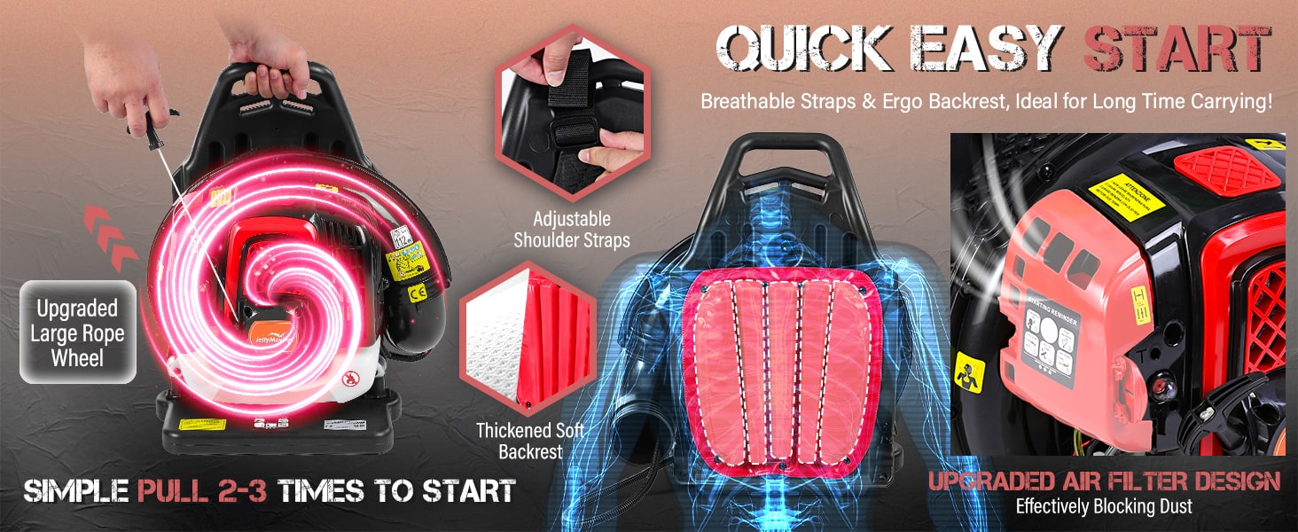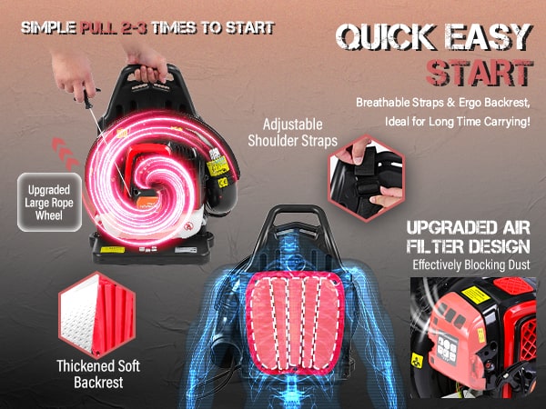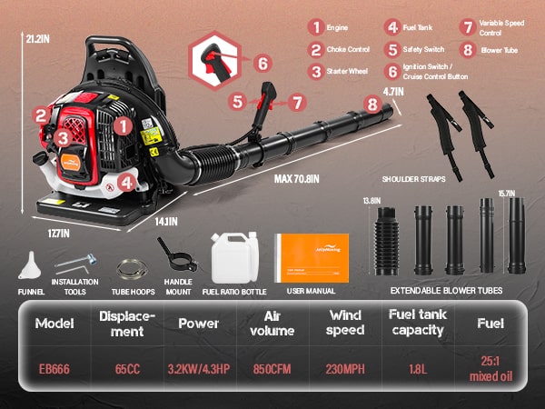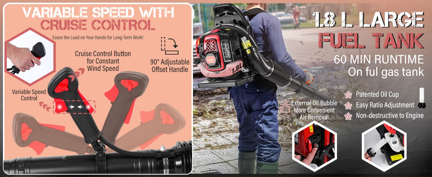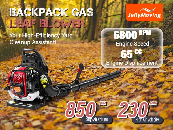 Tackle tough yard work with this powerful 65cc 2-cycle gas-powered backpack leaf blower. Boasting 4.3HP, 850CFM air volume, and 230MPH wind speed, our backpack blower can clear leaves, debris, and even light snow with ease. It features a comfortable, ventilated harness with shock absorption, cruise control, and a large 1.8L fuel tank for extended use. The easy-start external carburetor primer bulb gets you going quickly, and a variable throttle reduces fatigue during longer jobs. This gas leaf blower is ideal for all-season yard and lawn care!
