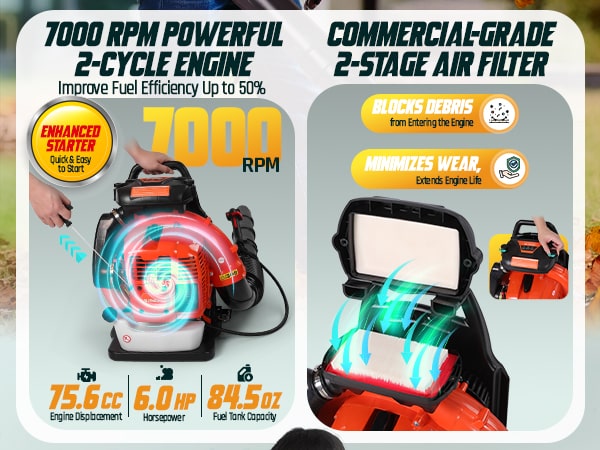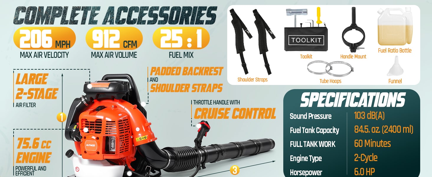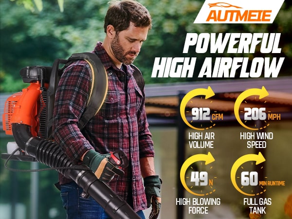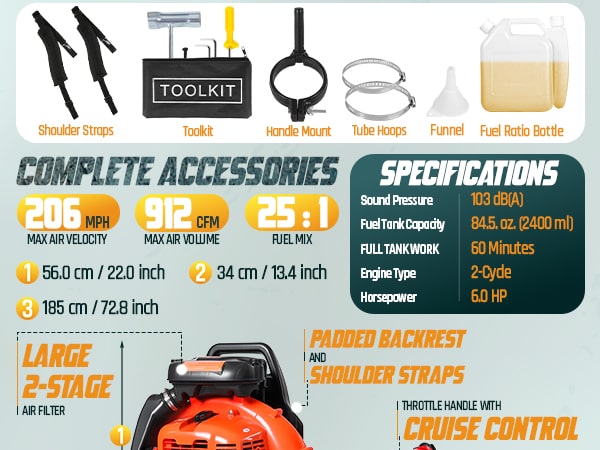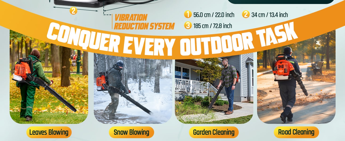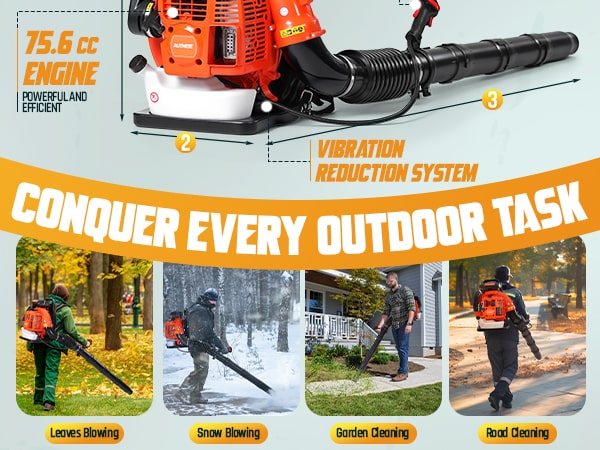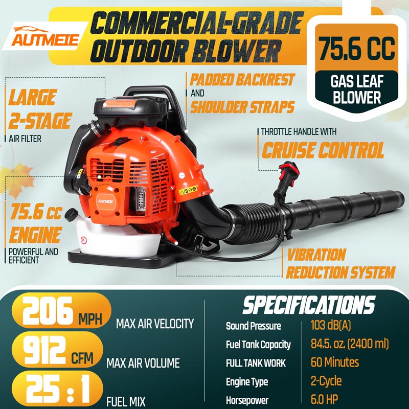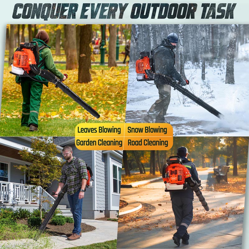 Power through any outdoor task with the 75.6CC gas-powered backpack leaf blower. With up to 912 CFM air volume and 206 MPH wind speed, it clears leaves, gravel, weeds, and snow in seconds. Work comfortably with the ventilated backpack harness and variable speed cruise control. The commercial-grade 2-stage filter keeps debris out and extends engine life. Durable, powerful, and professional, this backpack blower is perfect for yard, garden, driveway, or landscaping jobs!