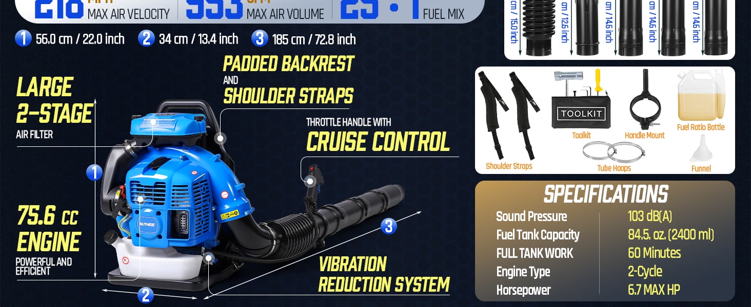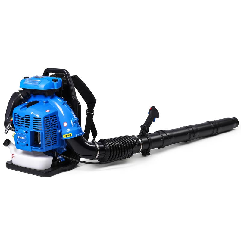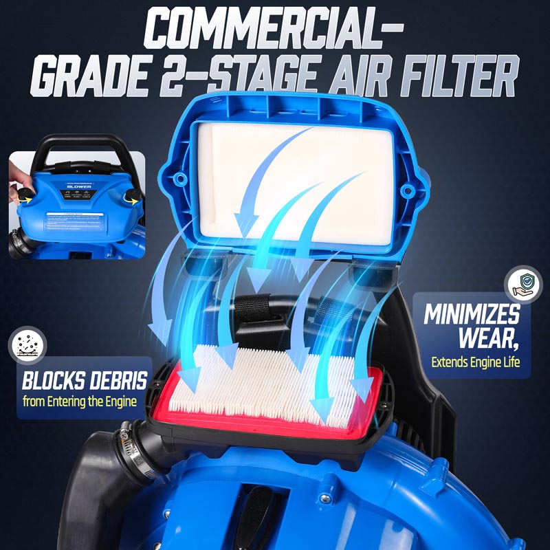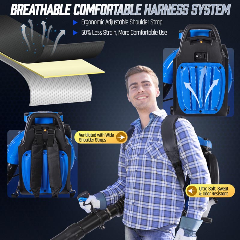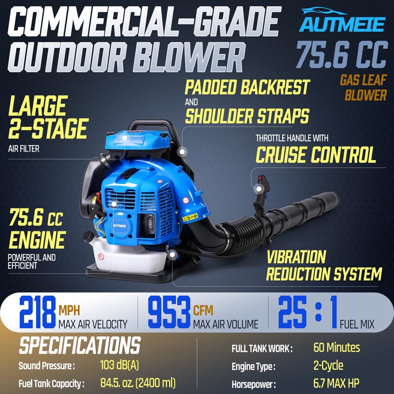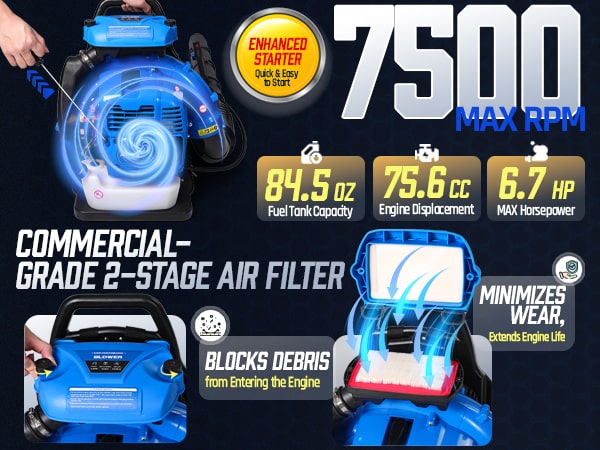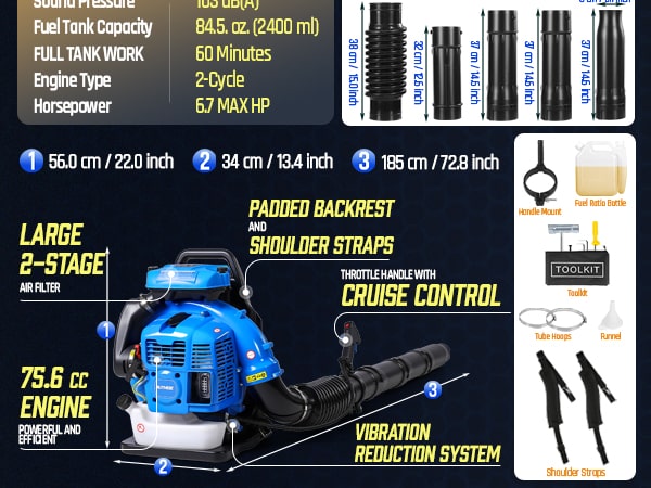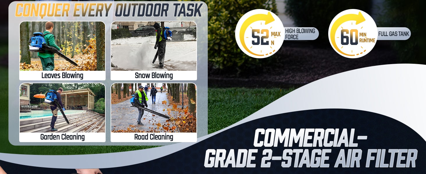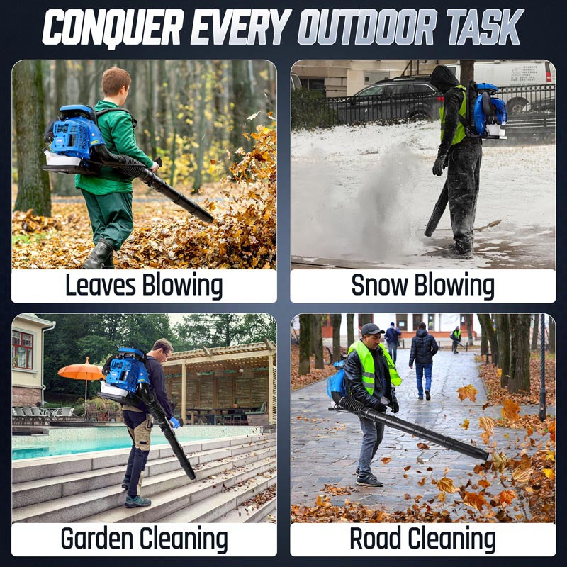 This high-performance 75.6CC backpack leaf blower gas-powered delivers serious power for heavy-duty yard cleanup. Powered by a 2-stroke engine producing up to 6.7 HP (5.0 kW peak), the backpack blower generates up to 953 CFM air volume, 218 MPH air speed, and 52 N blowing force under peak conditions to move wet leaves, grass, gravel, and stubborn debris with ease. The upgraded carburetor and ignition system support strong throttle response and stable high-speed operation, while the optimized airflow structure helps maintain consistent output during extended use. A commercial-grade dual-stage air filtration system helps reduce dust intake and internal wear, improving durability in dusty outdoor environments. The ergonomic backpack design features breathable padding and adjustable shoulder straps to help distribute weight evenly and reduce user fatigue. Variable-speed control with cruise control allows effortless airflow adjustment for different cleanup tasks, from light yard maintenance to heavy debris removal. Built for efficiency, comfort, and reliable power, this gas leaf blower is a dependable choice for yards, lawns, driveways, and property maintenance!