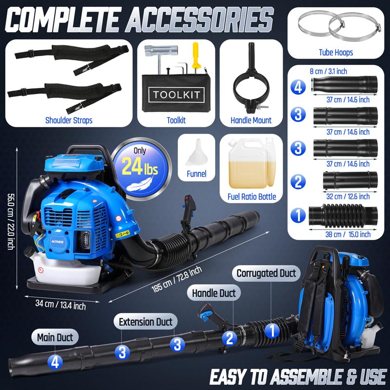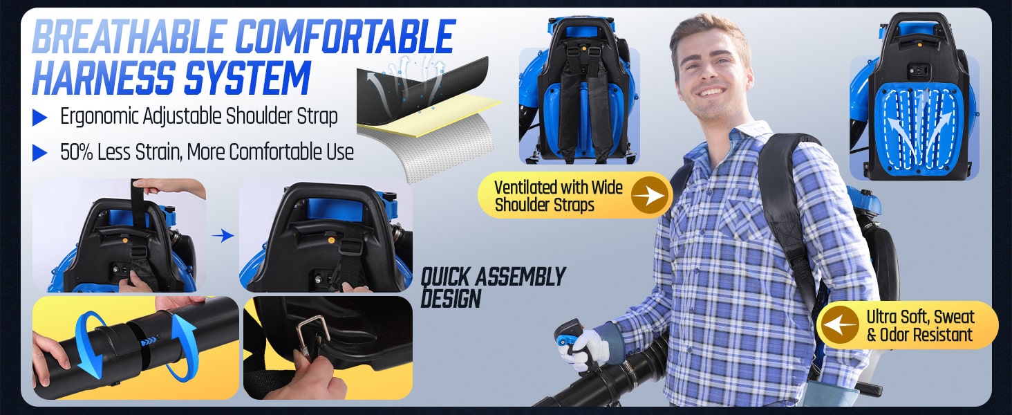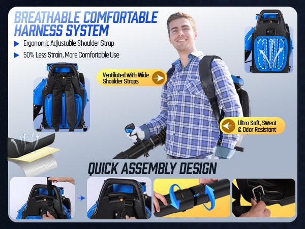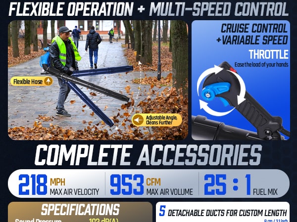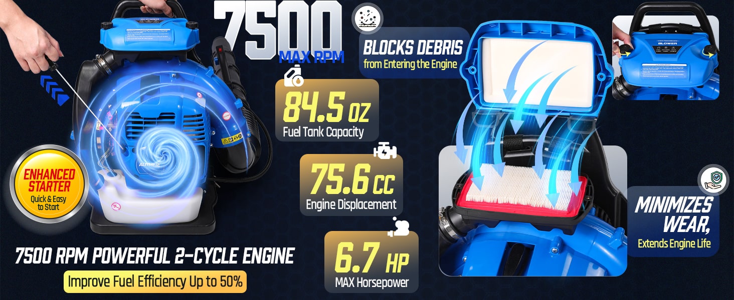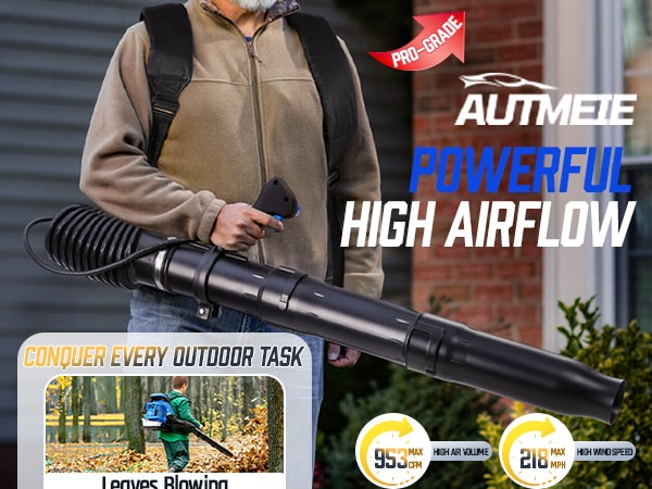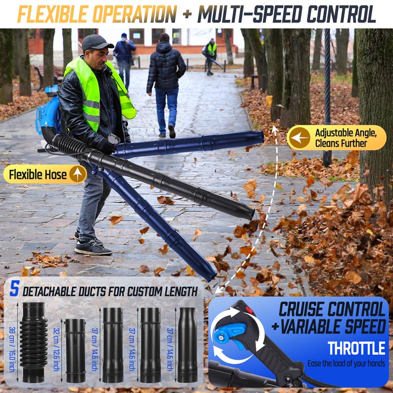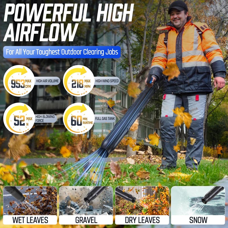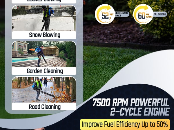 This high-performance 75.6CC backpack leaf blower gas-powered delivers serious power for heavy-duty yard cleanup. Powered by a 2-stroke engine producing up to 6.7 HP (5.0 kW peak), the backpack blower generates up to 953 CFM air volume, 218 MPH air speed, and 52 N blowing force under peak conditions to move wet leaves, grass, gravel, and stubborn debris with ease. The upgraded carburetor and ignition system support strong throttle response and stable high-speed operation, while the optimized airflow structure helps maintain consistent output during extended use. A commercial-grade dual-stage air filtration system helps reduce dust intake and internal wear, improving durability in dusty outdoor environments. The ergonomic backpack design features breathable padding and adjustable shoulder straps to help distribute weight evenly and reduce user fatigue. Variable-speed control with cruise control allows effortless airflow adjustment for different cleanup tasks, from light yard maintenance to heavy debris removal. Built for efficiency, comfort, and reliable power, this gas leaf blower is a dependable choice for yards, lawns, driveways, and property maintenance!