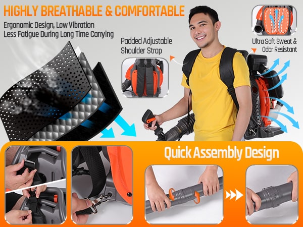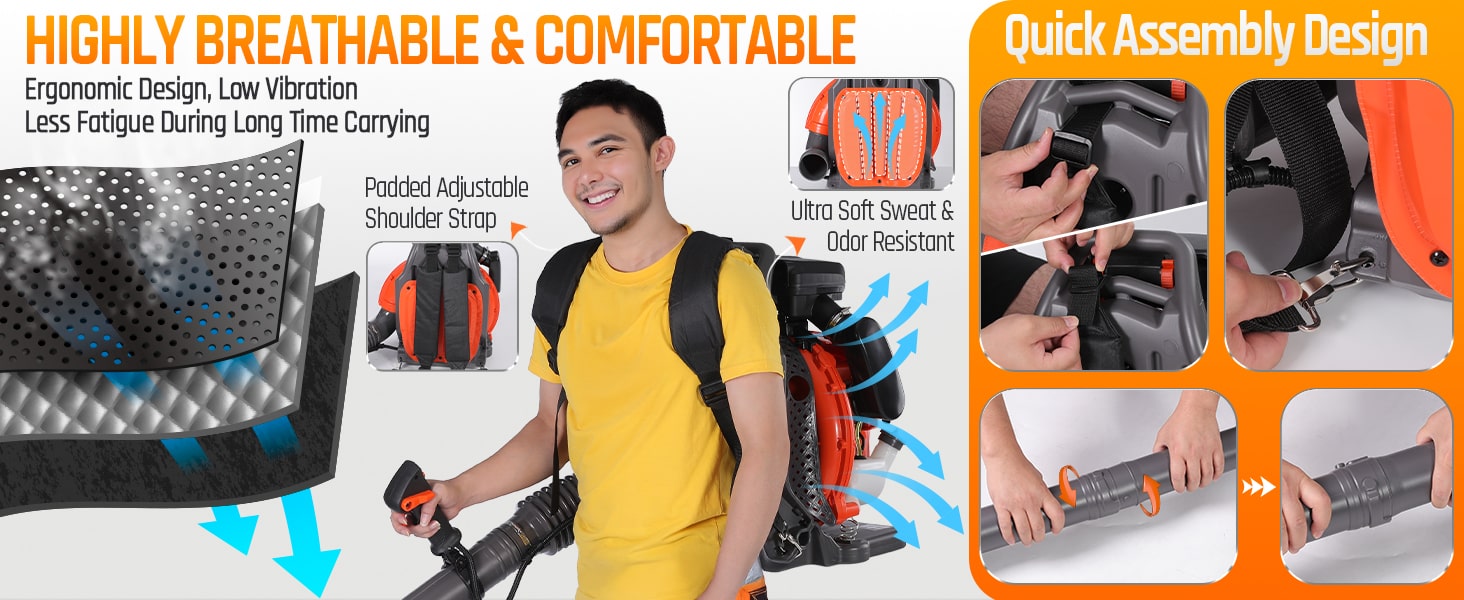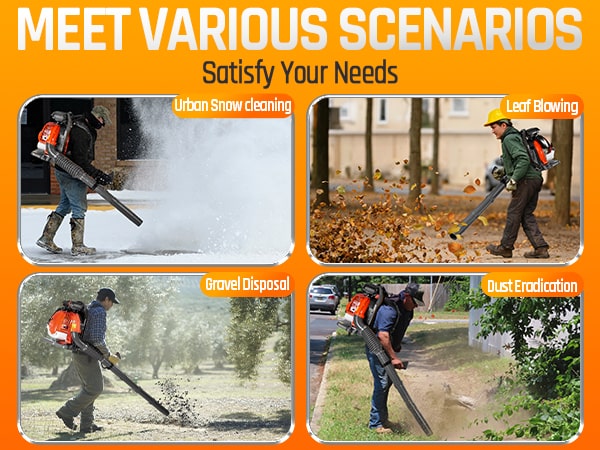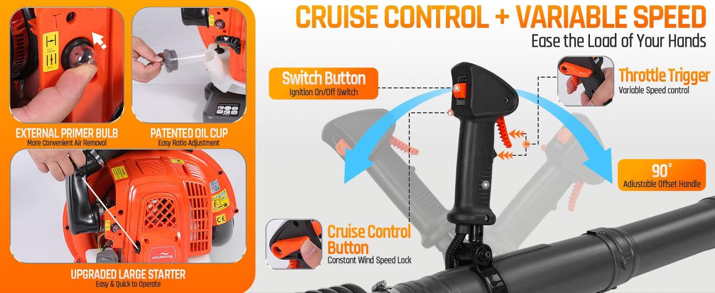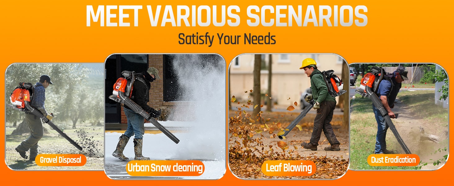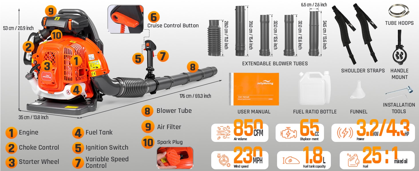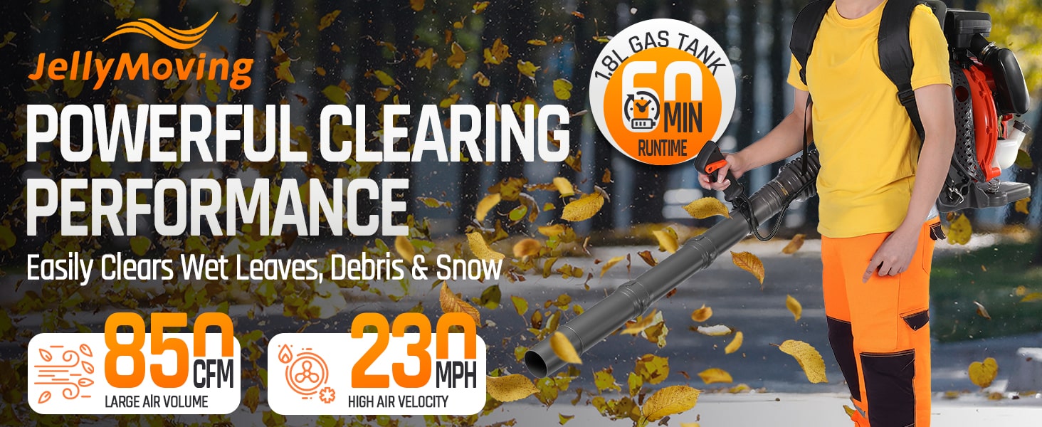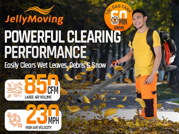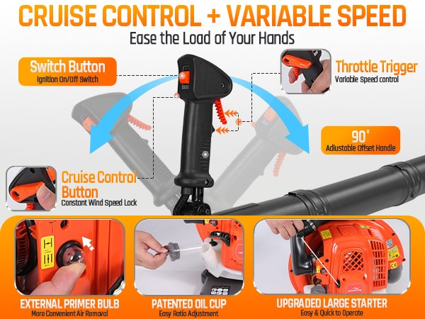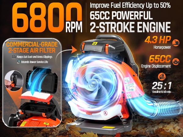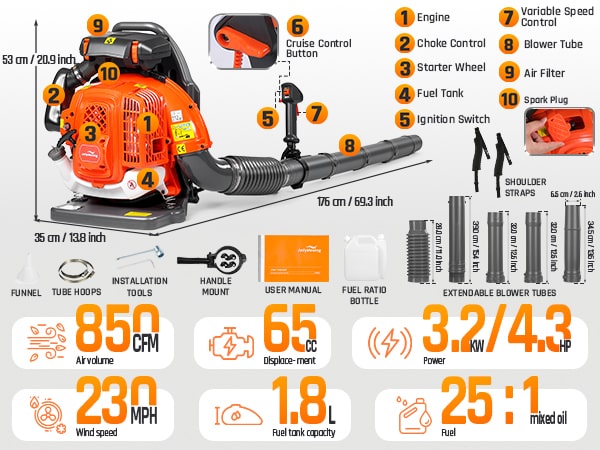Tackle tough yard work with this powerful 65cc 2-cycle gas-powered backpack leaf blower. Boasting 4.3HP, 850CFM air volume, and 230MPH wind speed, our backpack blower can clear leaves, debris, and even light snow with ease. It features a comfortable, ventilated harness with shock absorption, cruise control, and a large 1.8L fuel tank for extended use. The easy-start external carburetor primer bulb gets you going quickly, and a variable throttle reduces fatigue during longer jobs. This gas leaf blower is ideal for all-season yard and lawn care!